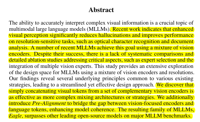 • Introduces Eagle: a family of MLLMs using mixture of vision encoders