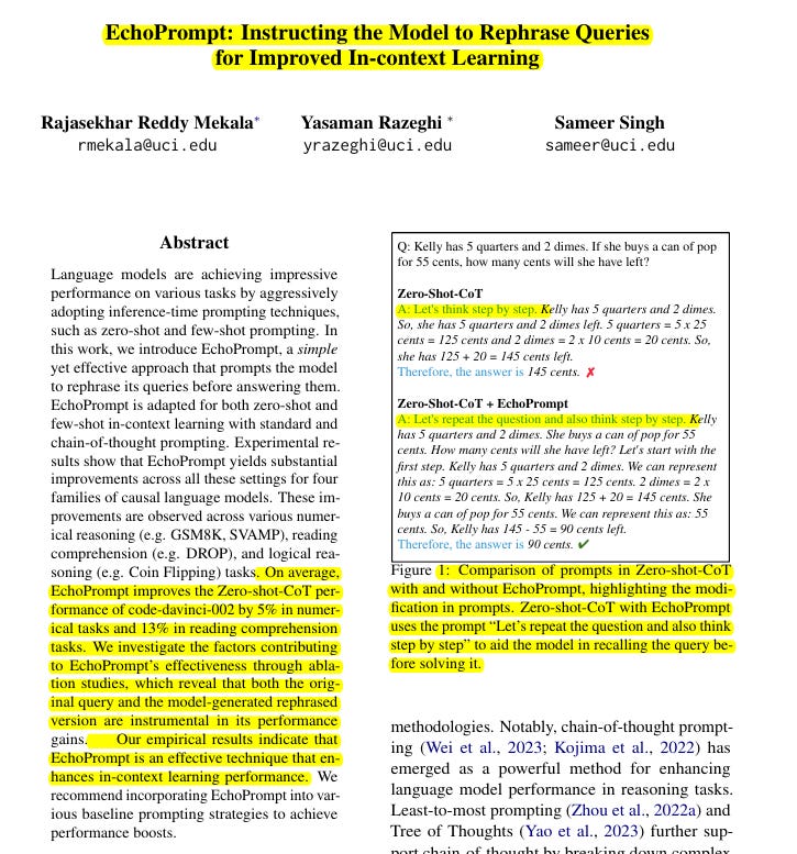 EchoPrompt enhances in-context learning for large language models by incorporating query rephrasing as a subtask. This technique aims to improve model performance across various reasoning tasks.