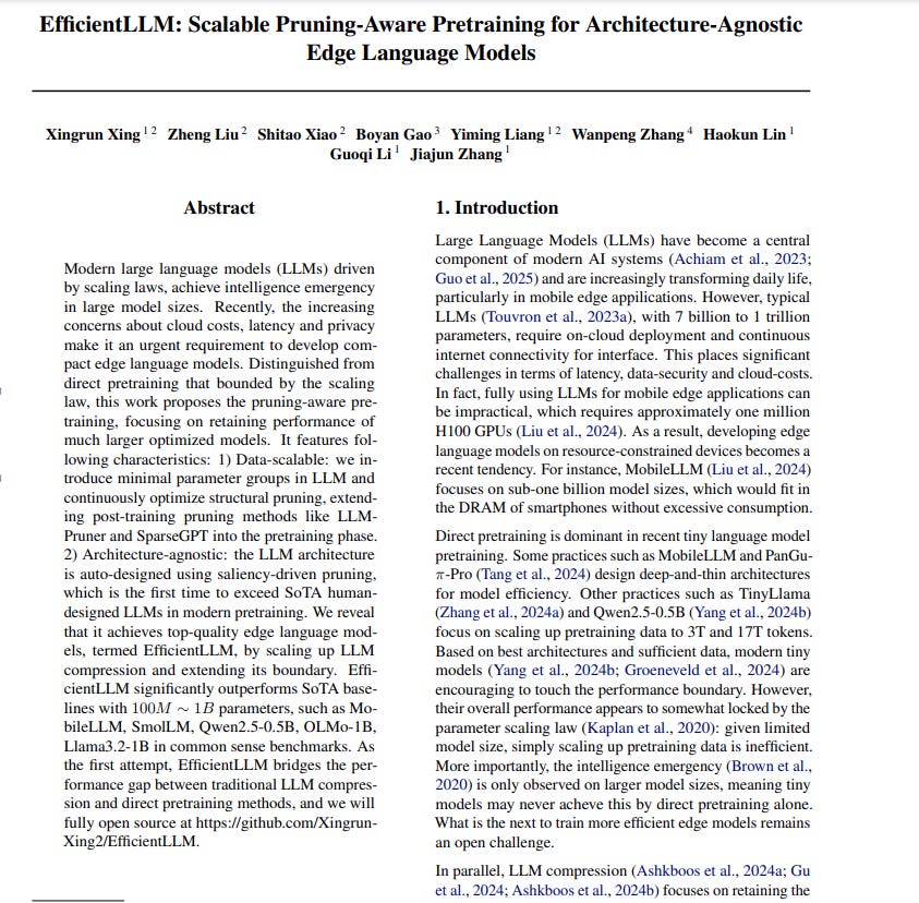 📌 EfficientLLM demonstrates that scaling pruning during pretraining, not just post-training, is crucial. This unlocks higher compression ratios without significant performance drops for edge deployment.