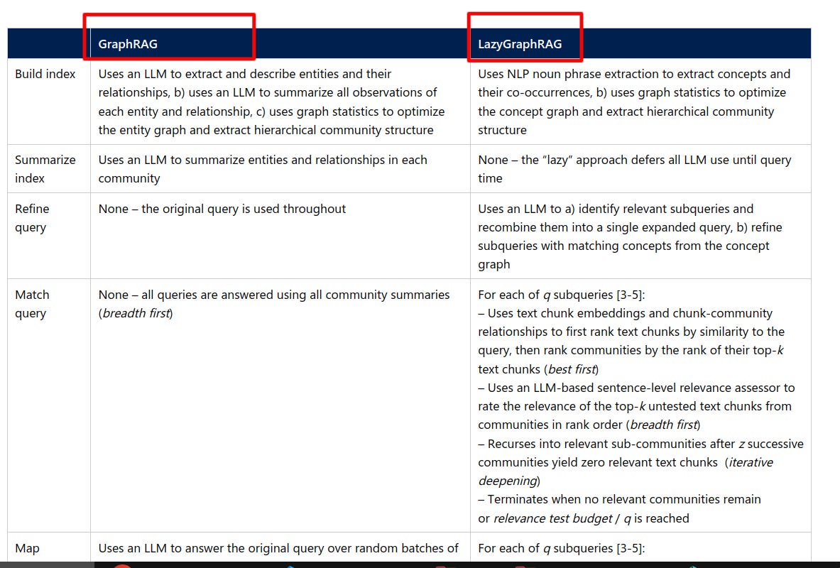 → LazyGraphRAG fundamentally transforms RAG by deferring LLM use until query time and eliminating prior source data summarization. The system combines best-first and breadth-first search in an iterative deepening manner, using relevance test budgets to control cost-quality tradeoffs.