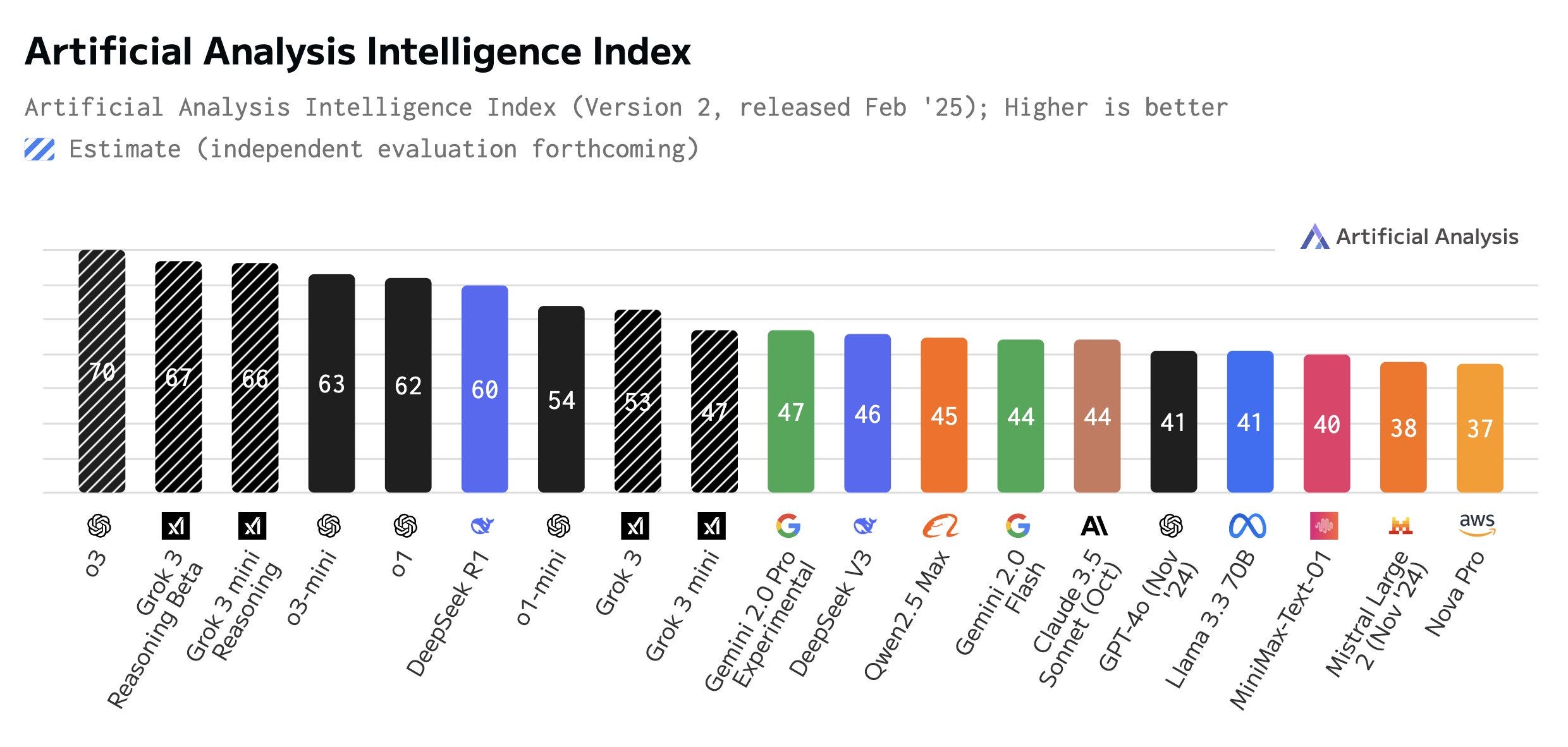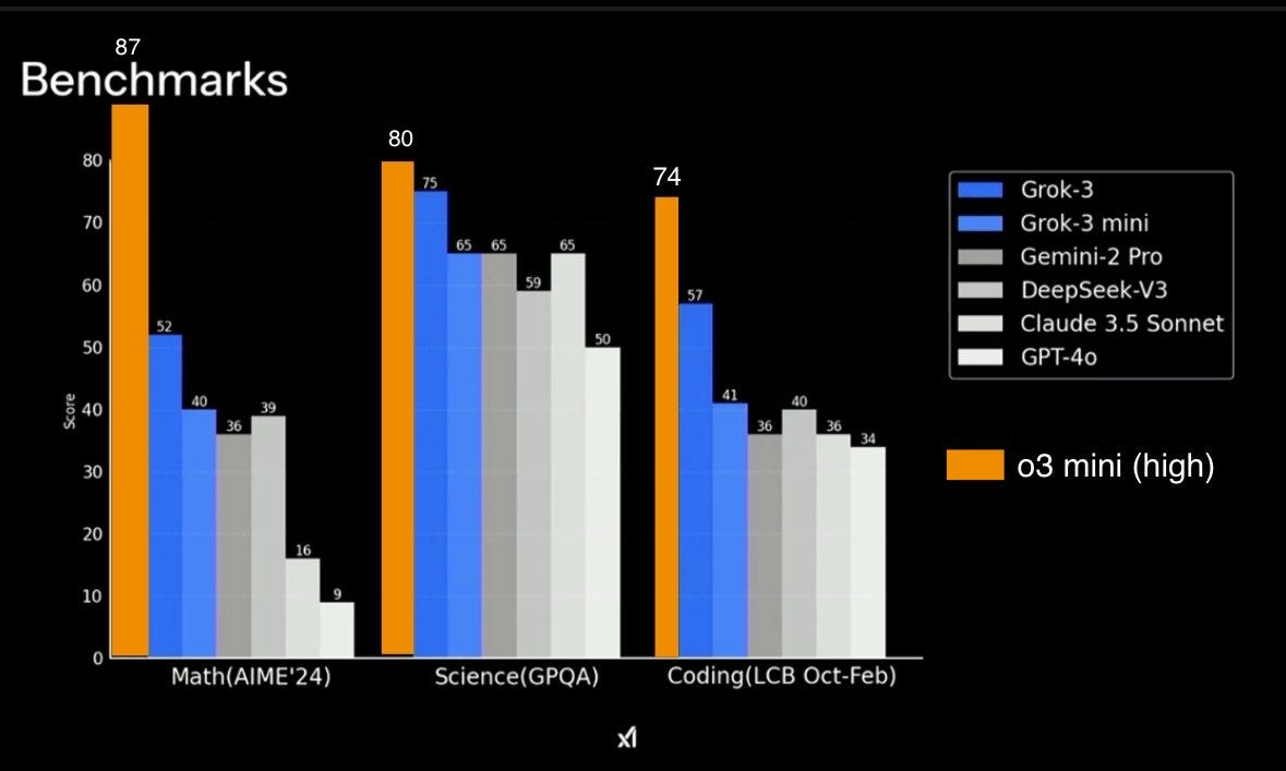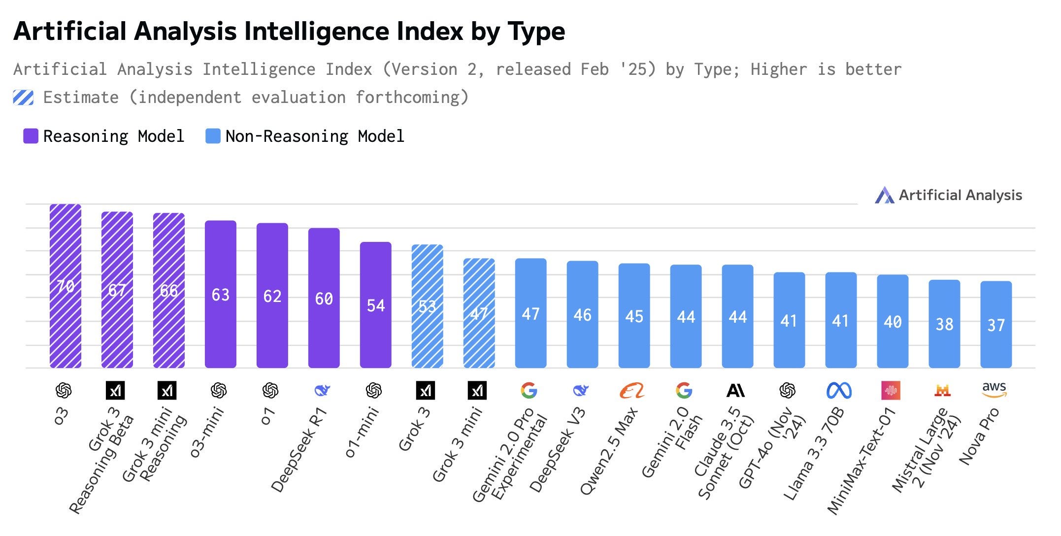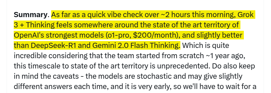 Accroding to them “Grok 3 Reasoning likely beats o3-mini and DeepSeek R1 to claim the mantle of the world’s leading reasoning model, pending the release of OpenAI’s full o3 model (still several weeks away)”