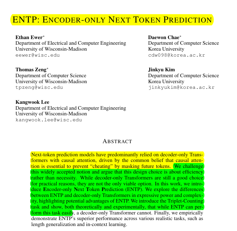 • Introduces Encoder-only Next Token Prediction (ENTP)