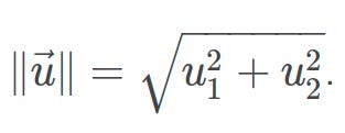 When we substitute our values in, we obtain that ∥u⃗ ∥=√25 = 5. Thus our vector u⃗ has length / norm of 5.