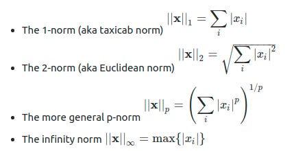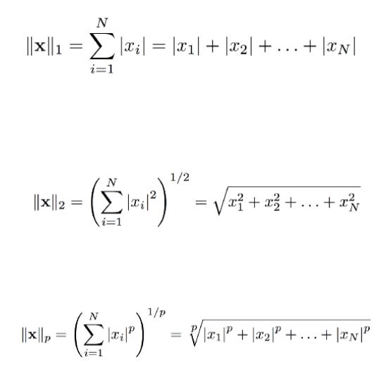 For a vector x having N components, the L¹ just adds up the components. Since we would like our magnitude to always be positive, we take the absolute value of the components. The L² norm takes the sum of the squared values, taking the square root at the end.