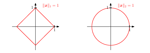 For different norms, the red lines indicate the set of vectors with norm 1. Left: Manhattan norm; Right: Euclidean distance.