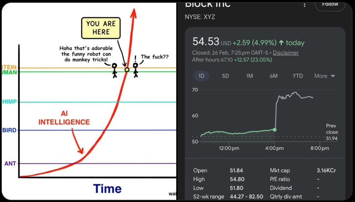 Block expects to spend up to $500mn in restructuring costs, but Wall Street loved the move and sent their stock price up by 24%. A permanent industry shift has started, where software companies will simply refuse to hire large human teams for tasks that algorithms can execute instantly.
