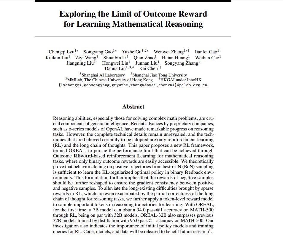 This paper introduces OREAL, an Outcome REward-based reinforcement Learning framework. OREAL uses behavior cloning on best-of-N sampled positive trajectories and reward shaping for negative samples. It also incorporates a token-level reward model to handle sparse rewards in long reasoning chains.