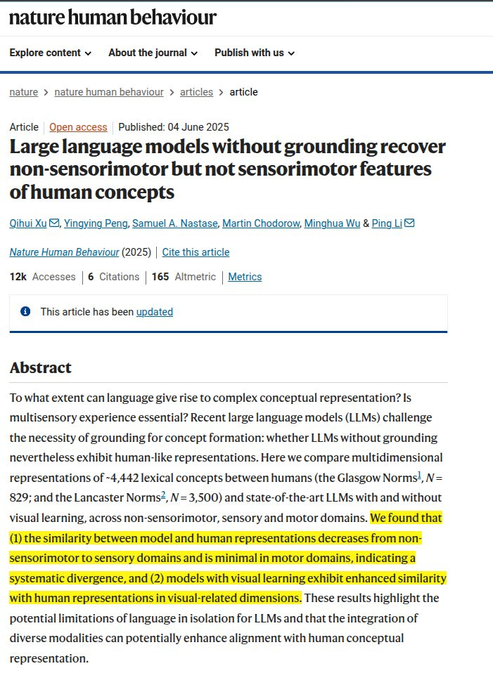 For example, this study shows that when AI models learn only from text, they can handle things like emotions or abstract ideas fairly well, but they struggle badly with things that require sensing or moving, like touch, vision, or physical action.