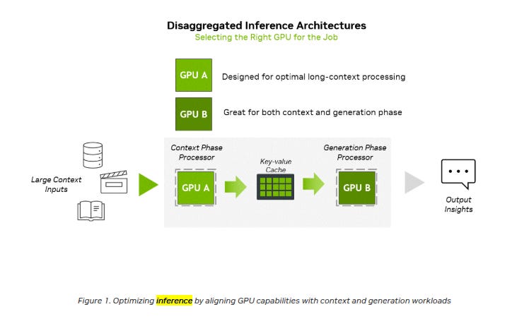 Disaggregation then hands generation to standard Rubin GPUs linked by NVLink, which favor high memory bandwidth to stream tokens while reading the key value cache.
