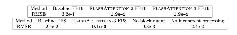 📌 For FP8 precision, FlashAttention-3 achieves 9.1e-3 RMSE, a significant improvement over the baseline FP8's 2.4e-2.