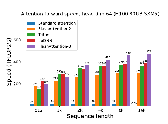 📌 Performance results: Achieves up to 740 TFLOPs/s (75% of theoretical max) for FP16 on H100 GPU. FP8 version reaches close to 1.2 PFLOPs/s. Outperforms cuDNN's optimized implementation for medium to long sequences.