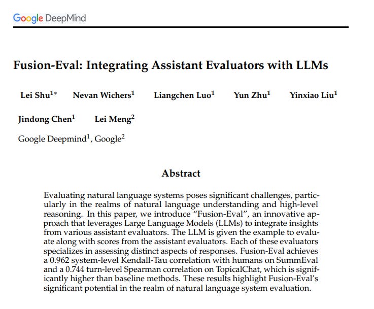 Nice ποΈ Paper - "Fusion-Eval: Integrating Evaluators with LLMs" is an innovative approach for evaluating Large Language Models (LLMs).