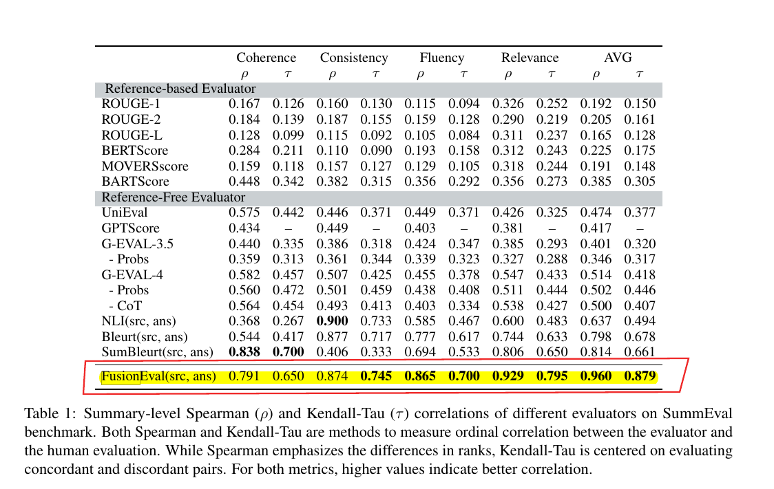 π Using OpenAI's GPT-4, the study compared Fusion-Evalβs scores to human evaluations, yielding high Spearman and Kendall-Tau correlations. These results indicate that Fusion-Eval surpasses the performance of individual evaluators, effectively aggregating their scores to align closely with human judgment.