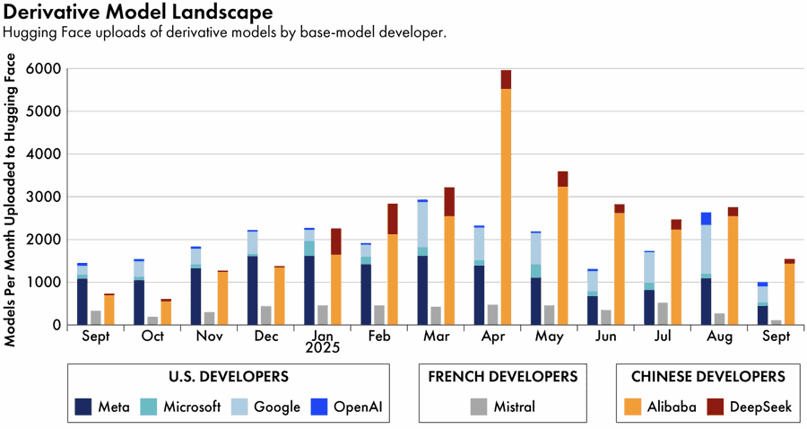 Chinese models are also winning over customers as geopolitical and cybersecurity concerns take a backseat to factors like cost, efficiency, and ease of use. And derivative models (finetuned or otherwise modified models) built on Chinese base foundations now absolutely exceed those built on US and European models. Alibaba towers over everyone from late 2024 into mid 2025, with around 5000 to 6000 Alibaba based derivatives in its peak month, several times the uploads built on Meta, Microsoft, Google, or OpenAI models.