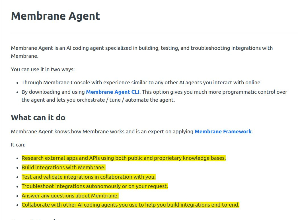 ⚙️ The Core Concepts: The system relies on Membrane Agent, which acts like a specialized senior engineer dedicated solely to building connections. You give the Agent a natural language command, such as “Sync contacts from HubSpot whenever they are updated.”