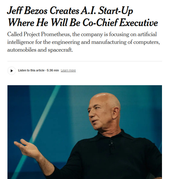 Prometheus is about AI that designs parts, plans builds, runs tests with robots, learns from results, then repeats faster than human only workflows, with a tight loop of propose, fabricate, measure, and update. Leadership pairs Bezos with Vik Bajaj, who previously built frontier R&D groups at Google X, Verily, and Foresite Labs.