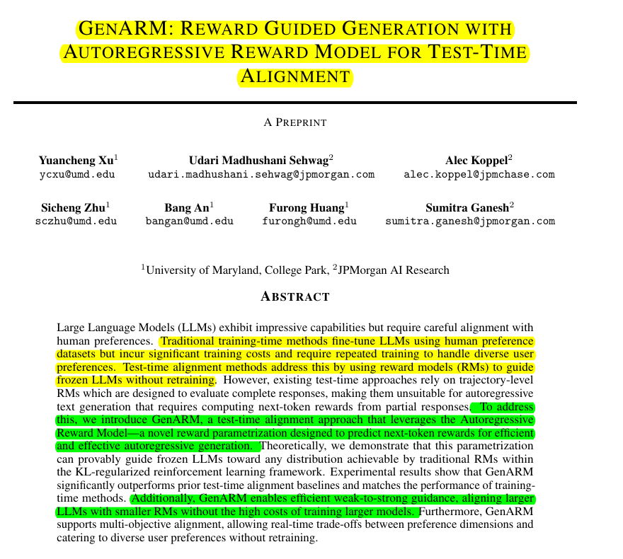 • GenARM enables efficient weak-to-strong guidance, aligning larger LLMs with smaller RMs