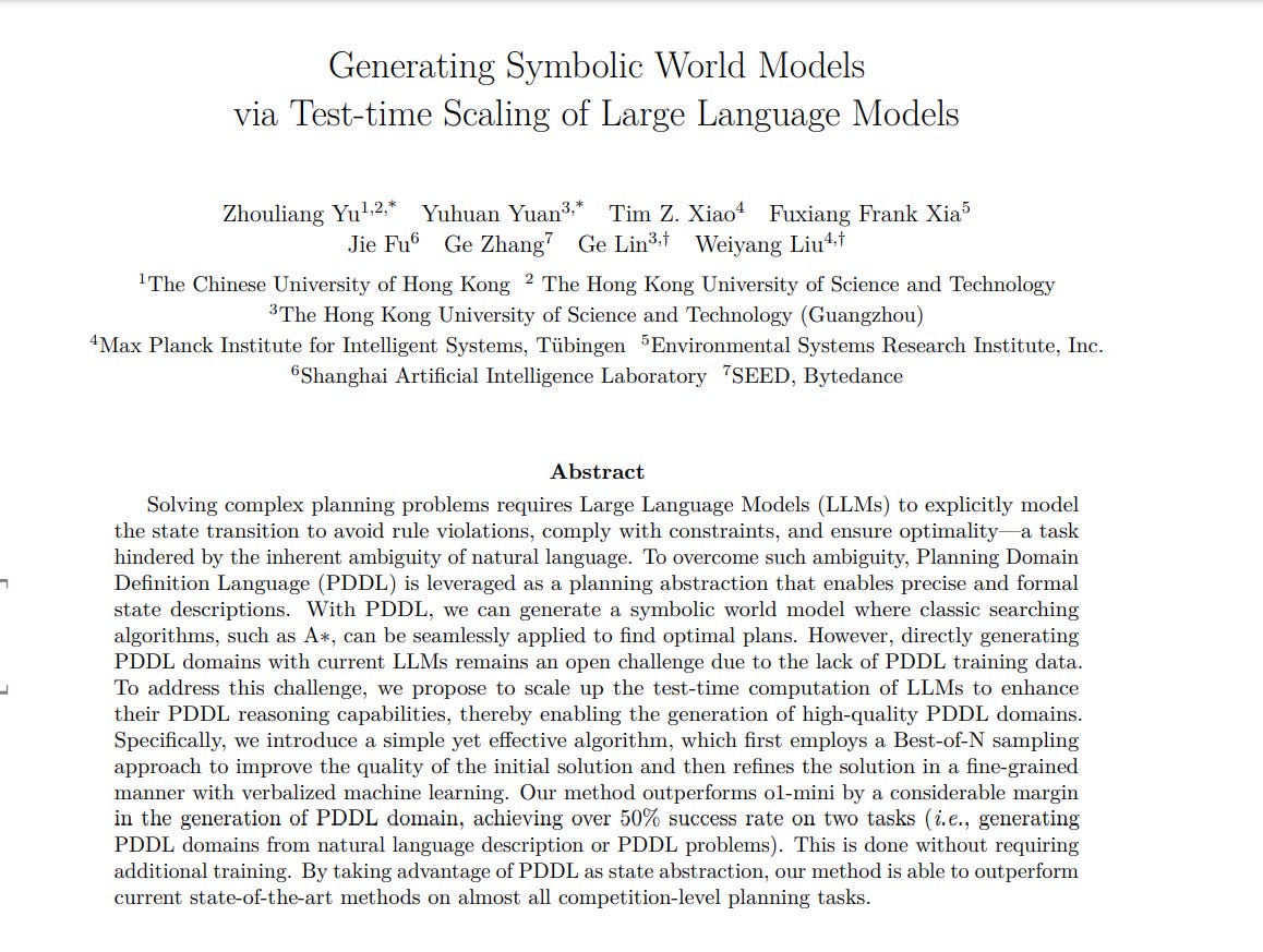 📌 This paper presents a practical method to create Planning Domain Definition Language world models using LLMs without extra training. It leverages test-time compute scaling to improve logical reasoning for complex planning tasks.