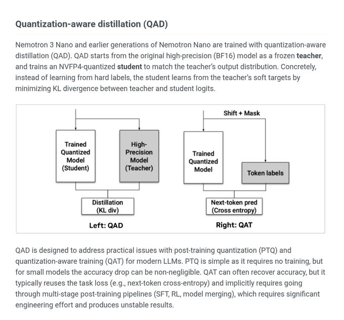 In the below image, on the left, quantization-aware distillation (QAD) uses a high-precision model as a frozen teacher and a 4-bit model as a student.