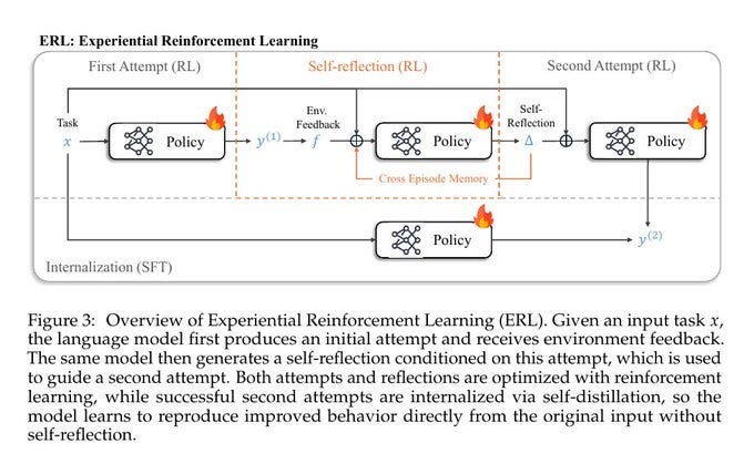 ERL inserts an extra step that turns feedback into a specific correction, and reinforces the full sequence of 1st attempt, reflection, and improved 2nd attempt. It then distills the successful 2nd attempts back into the base model so it can act from the original input without reflection at deployment. Reflection is mainly triggered on failures to avoid instability and reward hacking, and a cross-episode memory can reuse good reflections but can also spread bad ones.