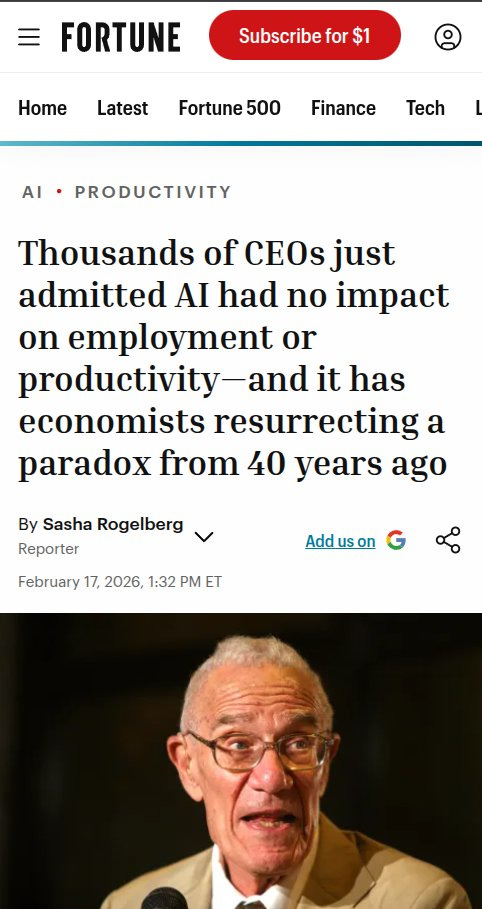 🗞️ A new international survey by the National Bureau of Economic of nearly 6,000 CEOs & executives finds that AI is widely adopted but barely shows up in jobs or productivity yet, echoing Robert Solow’s old “productivity paradox” from the early computer era.