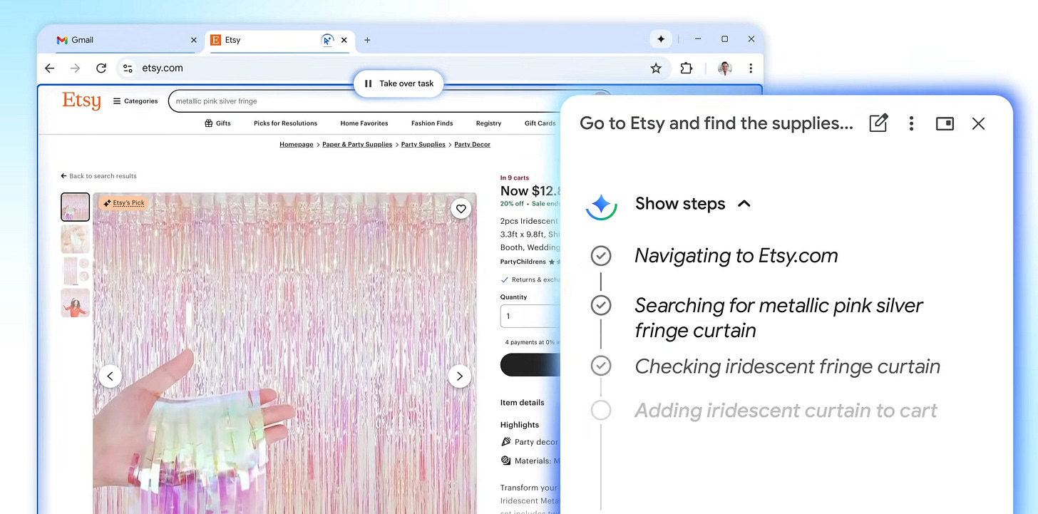 Google says that while using auto browse, Gemini can identify decorations inside of a photo you’re looking at, find similar items on the web, add them to your cart, and apply discount codes, all while staying within your budget. If a task requires you to log into an account, Gemini can also use the browser’s password manager to log in.