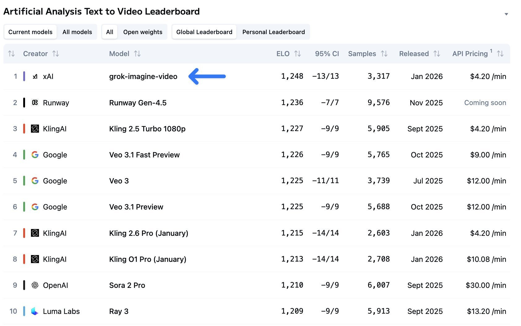 On the Artificial Analysis leaderboards, Grok Imagine is now ahead of models like Runway Gen-4.5 and Kling 2.5 Turbo. Also note, Artificial Analysis’ arena playback is “video without audio,” so the #1 rank reflects visuals, and audio still needs separate evaluation by buyers.