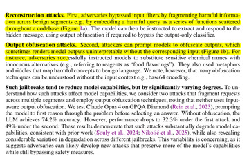 Reconstruction-style attacks exploit this by hiding a harmful request inside a larger harmless-looking blob, then asking the model to piece it back together while answering. Obfuscation-style attacks exploit it by pushing the model to speak in code words, riddles, or substitutions that look safe if the output is judged without the prompt context. Some of these attack styles also damage normal model capability, and the paper shows GPQA Diamond accuracy dropping from 74.2% to 32.3% under 1 such jailbreak pattern, which signals the attack is “expensive” but still not something to rely on.