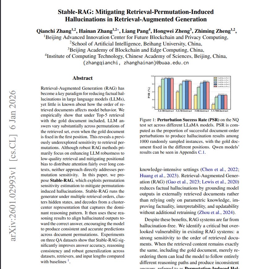 Stable-RAG deals with this by running the LLM on many different document orders, grabbing its final hidden state, meaning its last internal summary, and grouping those summaries to find the dominant reasoning path. It then decodes answers from the center of each group and uses Direct Preference Optimization, a training method that prefers better answers over worse ones, to push the model toward consistent, evidence grounded outputs or “I don’t know”. On 3 question answering datasets with 2 retrievers, meaning 2 ways to fetch documents, Stable-RAG improves accuracy and keeps answers stable across reorders, so a small shuffle does not change what the system says.