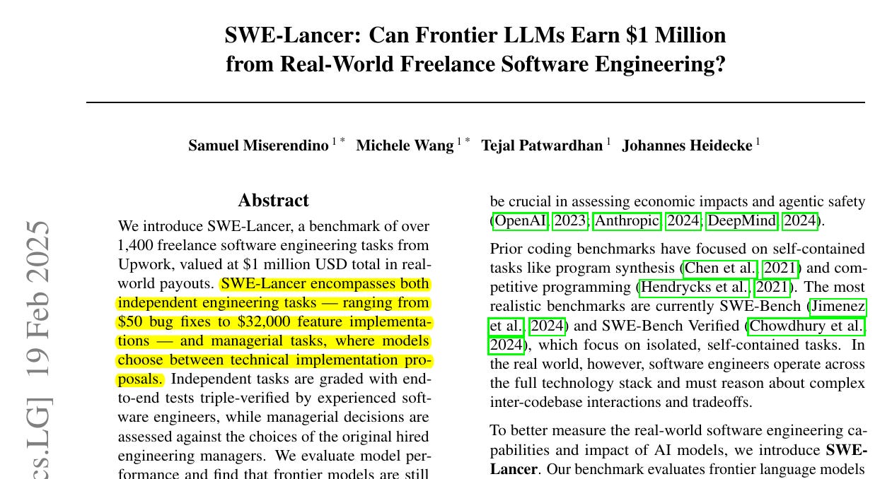 → SWE-Lancer is open-source, with a public evaluation set (SWE-Lancer Diamond) containing $500,800 worth of tasks for further research.
