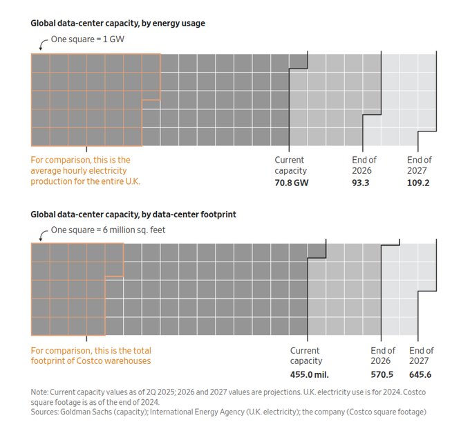 Power capacity goes from 70.8GW today to about 93.3GW at the end of 2026 and 109.2GW at the end of 2027, while floor space climbs from 455.0M square feet to 570.5M then 645.6M square feet. AI and cloud build out is pushing data center power and land use to the scale of whole countries.