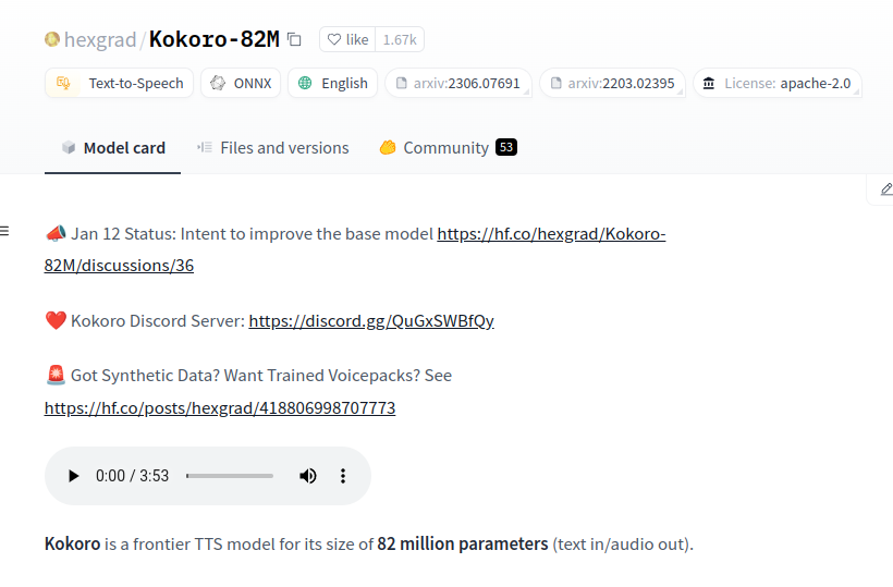 → The ONNX implementation enables wider hardware compatibility, although it runs slower than the PyTorch version. The model supports American and British English with 10 voicepacks released under Apache 2.0 license.