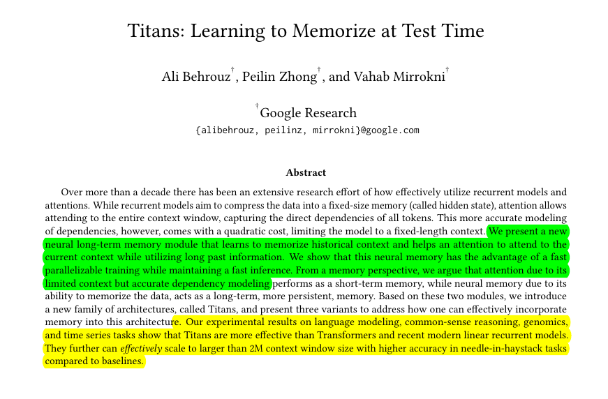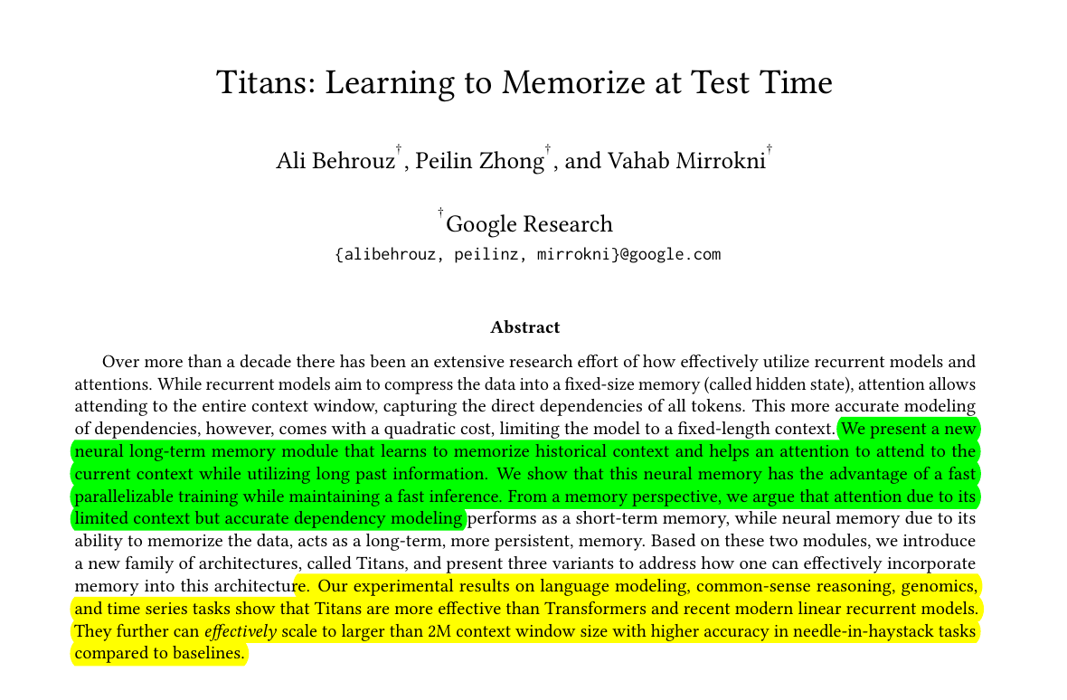 🧠 Google Released Breakthrough New Architecture Which Effectively Scale To Larger Than 2m Context Window With Memory at Test Time