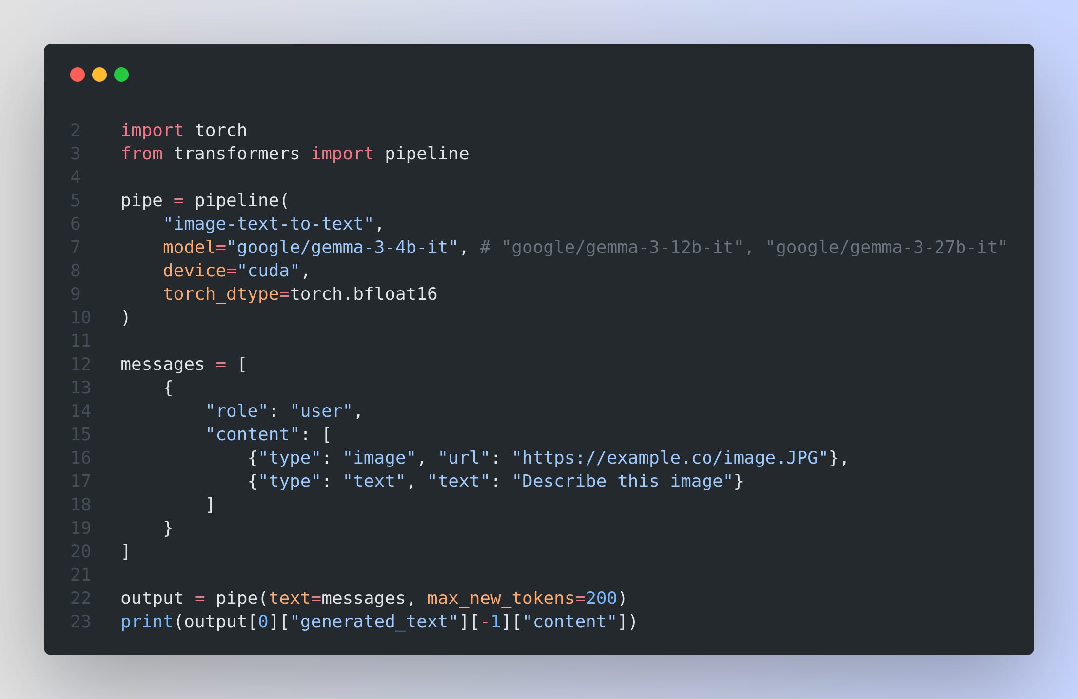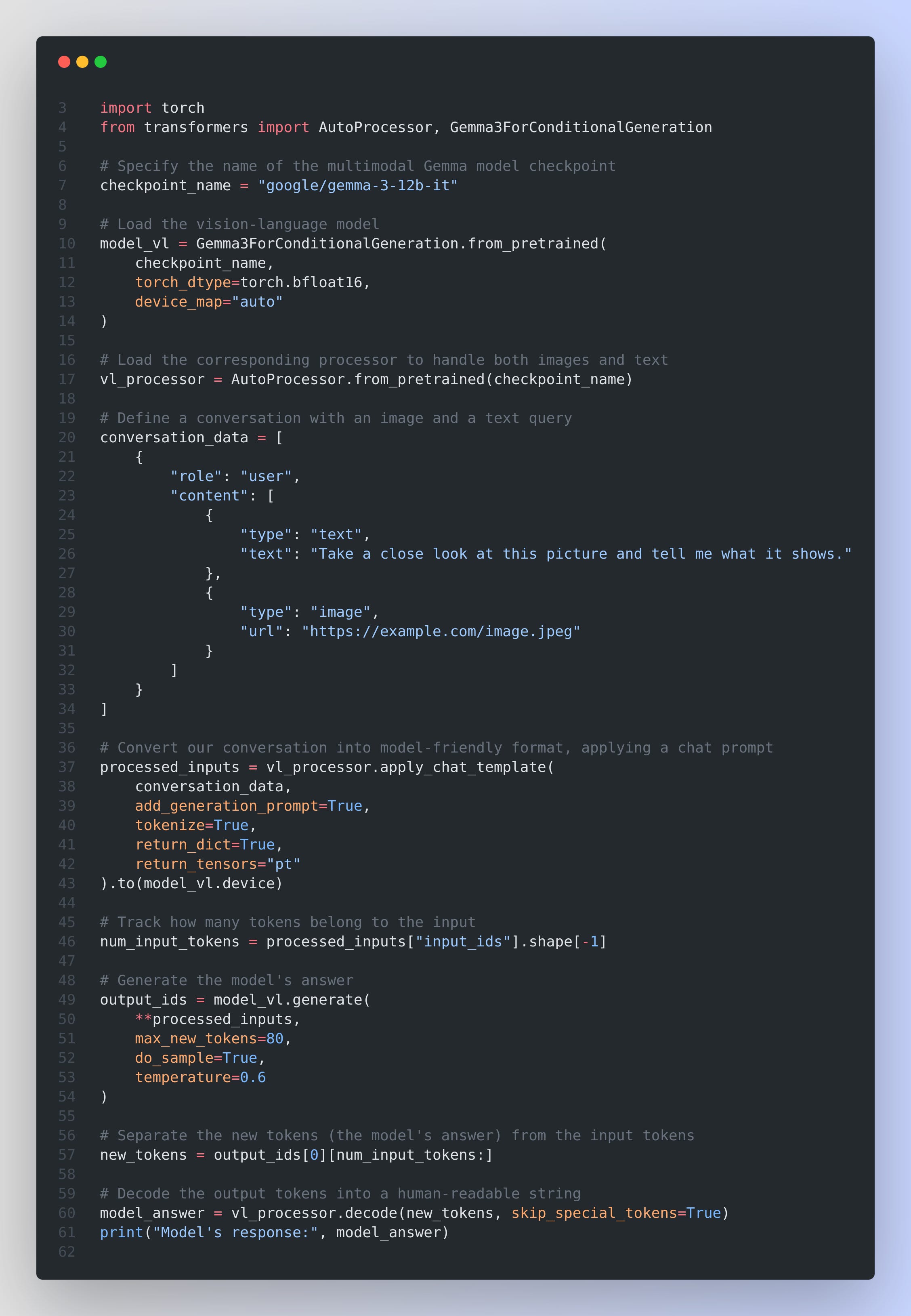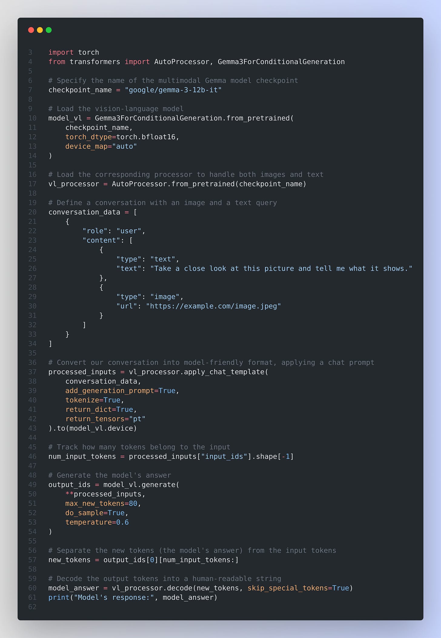 And below is an example of a more detailed inference with the Hugging Face transformers library using Gemma 3