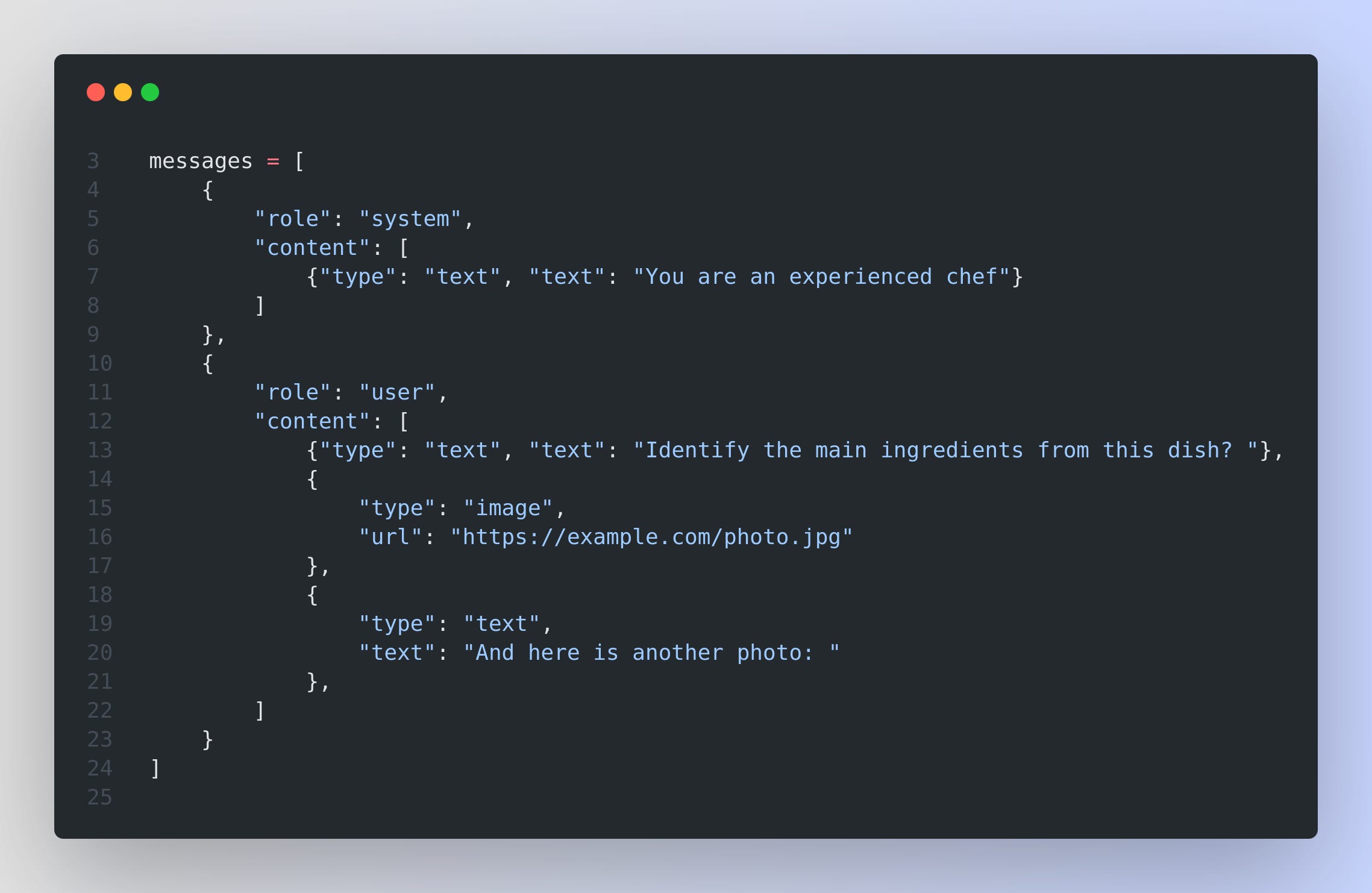 You can combine (“interleave”) text and image inputs within a single conversation. Instead of sending text alone, you can insert images at specific points in the text and treat them as additional inputs for the model to consider.