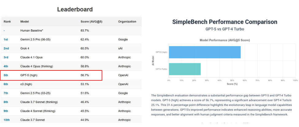 The SimpleBench score is out for GPT-5 and its at 5th pace with 56.7%
