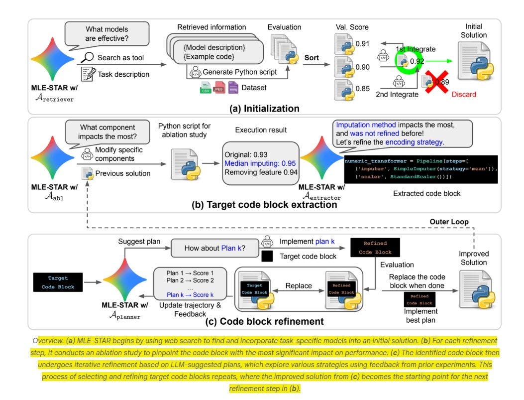 MLE‑STAR nails 63% medal wins on Kaggle’s MLE‑Bench‑Lite by mixing web‑sourced ideas with laser‑focused code tweaks. It tackles the grind of trial‑and‑error ML engineering, where today’s agents cling to generic libraries and reshuffle whole scripts instead of fixing the piece that actually hurts.