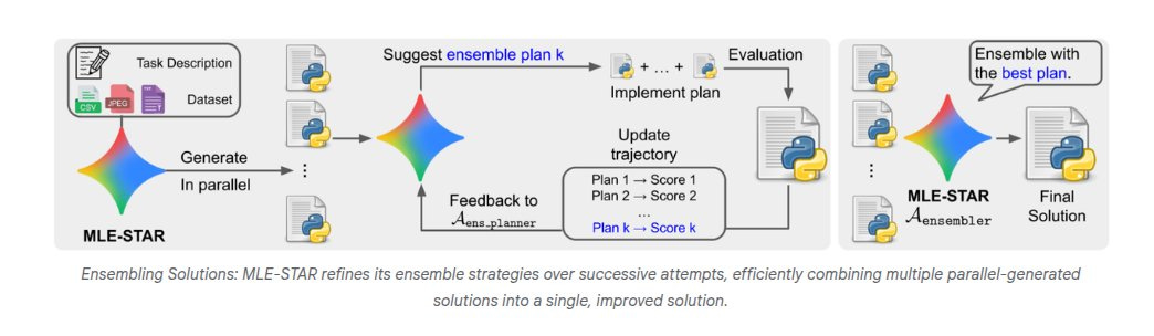 Instead of a lazy average, MLE‑STAR asks the LLM to draft an ensemble recipe, tests it, then rewrites that recipe if the lift is small. Over a few cycles, separate scripts converge into one blended model that usually beats every single candidate. The diagram on page 4 shows this inner loop of propose‑evaluate‑refine.