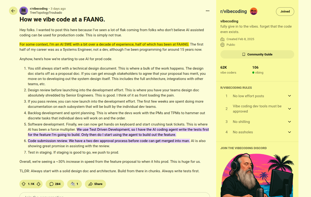The process described in the Reddit post for FAANG-level vibe-coding starts with a technical design doc, then a design review by senior engineers, then subsystem docs, then sprint planning, then Test Driven Development where the agent helps write tests, then 2-reviewer code review, then staging, then production. The author reports about 30% faster delivery from feature proposal to production, because the process is strong and AI accelerates the boring parts, not because process disappears.