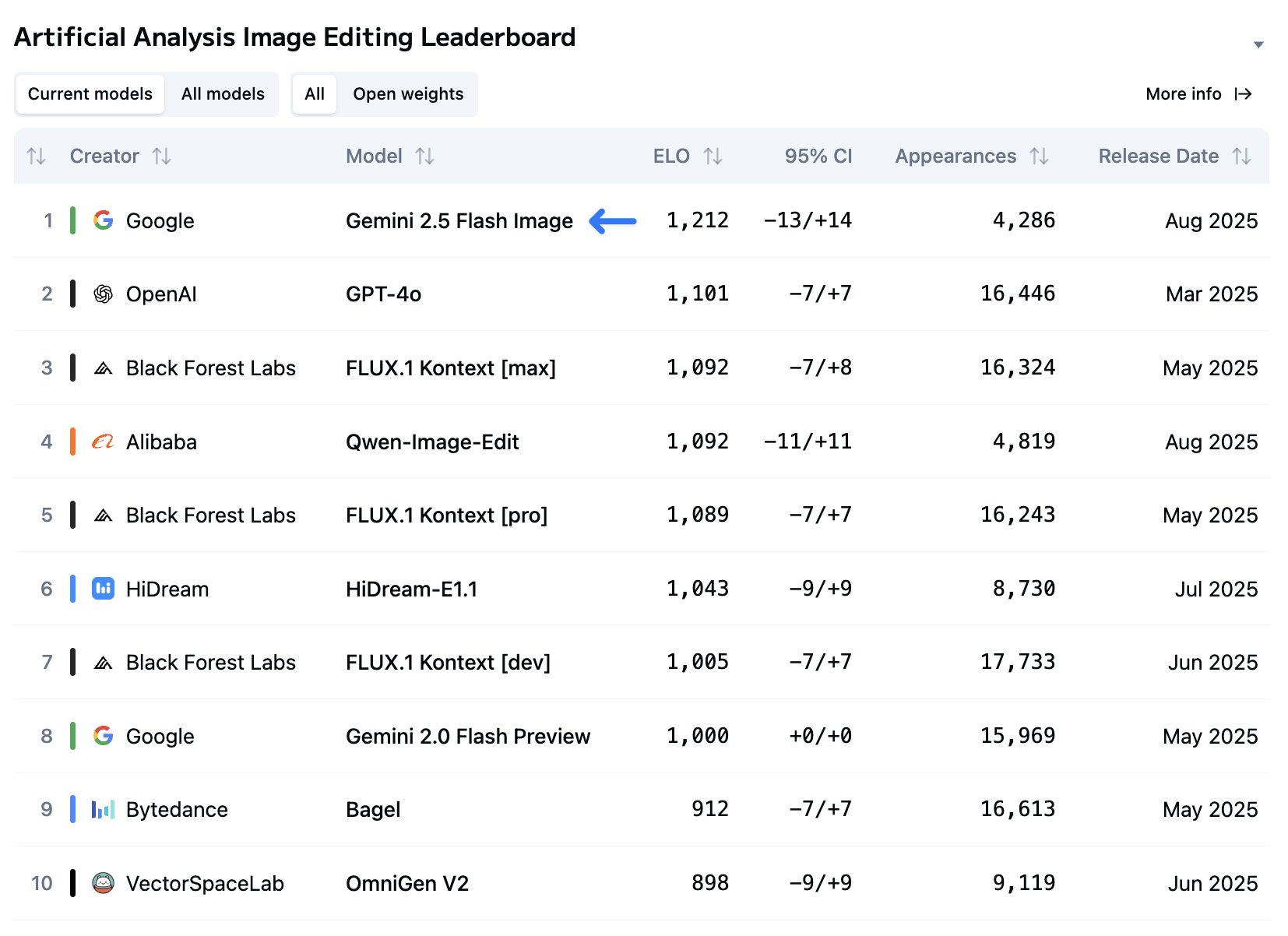 Google's Gemini 2.5 Flash Image (Nano-Banana) takes the crown as the leading image editing model, beating GPT-4o and Qwen-Image-Edit in the Artificial Analysis Image Editing Arena!