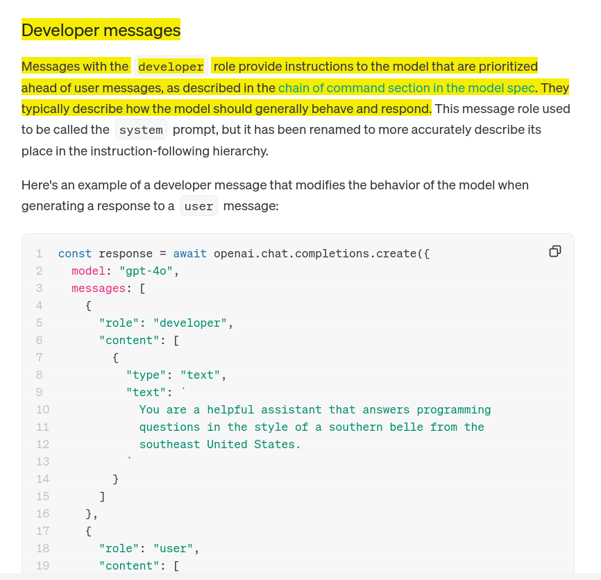 OpenAI introduces "developer" role to replace traditional “system” prompts in their API, representing a restructuring of their prompt hierarchy system. The change reflects a more precise designation of prompt types and their command authority in the API's instruction-following architecture.