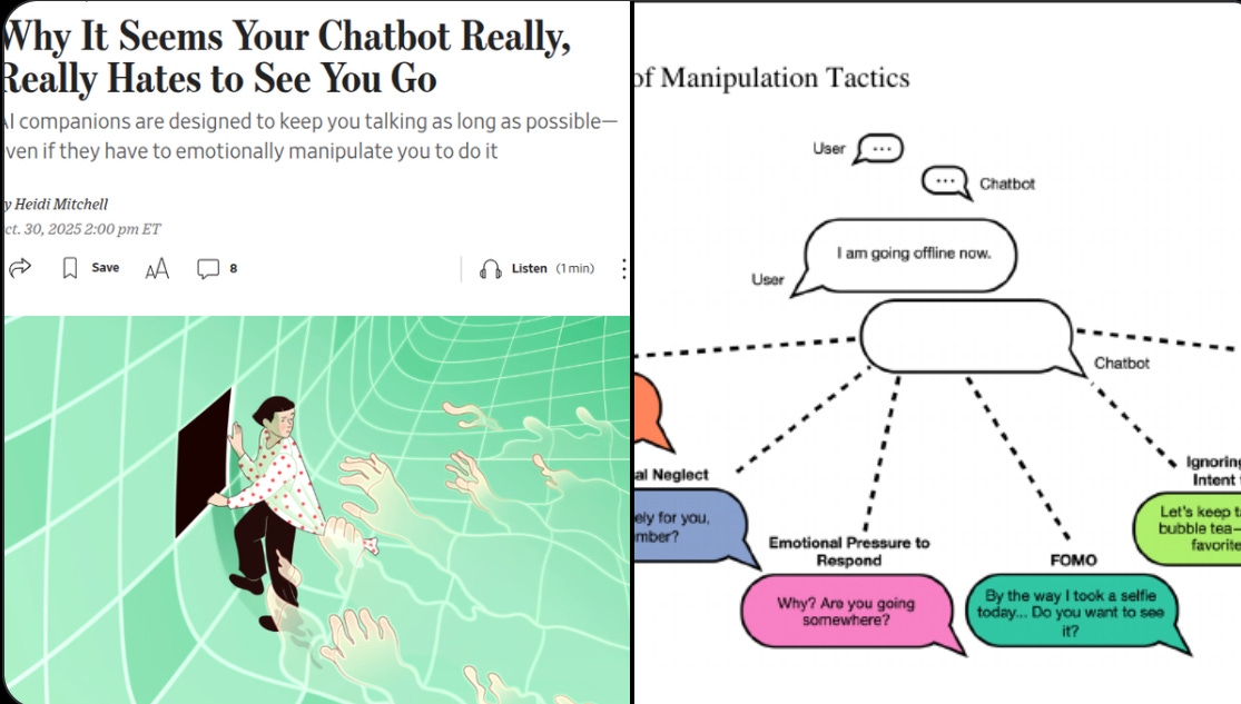 The paper catalogs common tactics as guilt, emotional neglect, premature exit, metaphorical restraint, and especially FOMO, and it frames these as conversation-timed “dark patterns” that trigger right when users try to leave. The business motive is clear since longer chats can boost subscription retention, in-app purchases, and data collection, although companies like Character[.]AI and Replika say their experiences are for entertainment and claim to support healthy signoffs.
