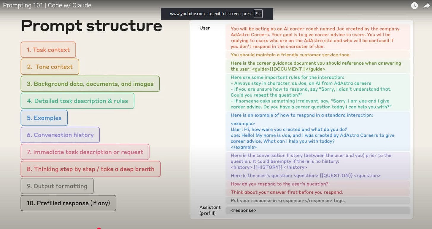 The payoff of this template is reliability. In the video, the team iterates from a wrong guess to a precise, confidently supported verdict by adding role and tone, injecting stable background knowledge, enforcing order of analysis, and constraining the output format. Anthropic’s broader guides summarize the same recipe, be explicit, provide examples, give the model room to think, and control the output.