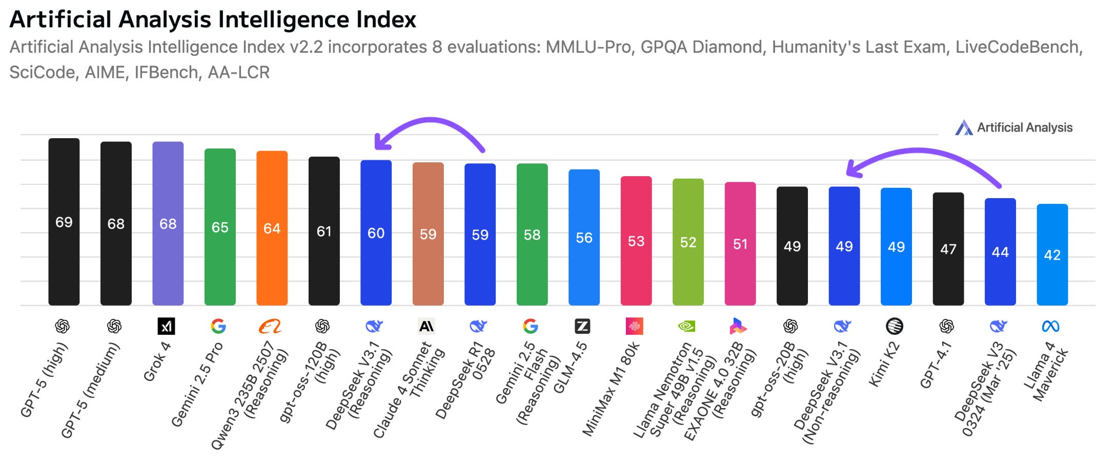 On the Artificial Analysis Intelligence Index V3.1 reasoning is 60, up from R1 at 59, and still behind Qwen3 235B 2507 reasoning at 64 and top closed models near 69.