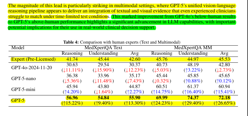 GPT-5 (full) beats human experts on MedXpertQA multimodal by 24.23% in reasoning and 29.40% in understanding, and on MedXpertQA text by 15.22% in reasoning and 9.40% in understanding. 🔥