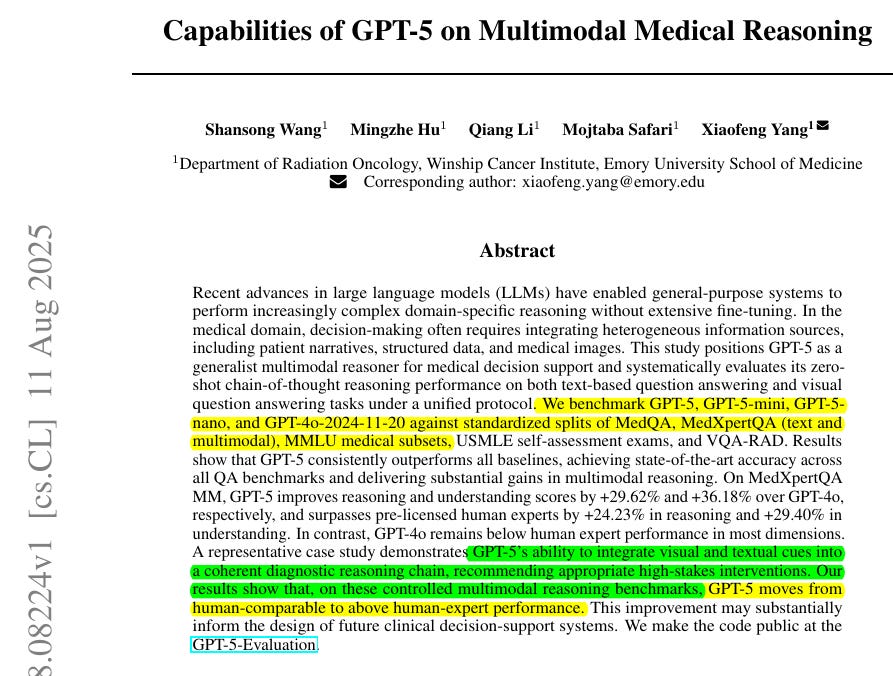 It compares GPT-5 to actual professionals in good standing and claims AI is ahead. GPT-5 is tested as a single, generalist system for medical question answering and visual question answering, using one simple, zero-shot chain of thought setup.