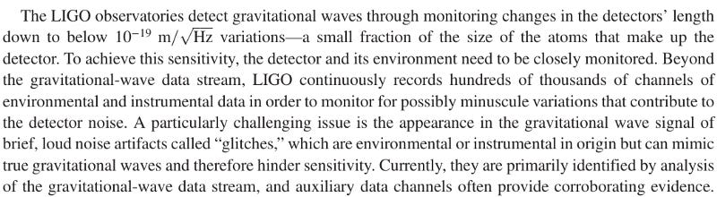 The paper goes on to say, Modern interferometric gravitational-wave (GW) detectors are highly complex and sensitive instruments. Each detector is sensitive not only to gravitational radiation, but also to noise from sources including the physical environment, seismic activity, and complications in the detector itself. The output data of these detectors is therefore also highly complex. In addition to the desired signal, the GW data stream contains sharp lines in its noise spectrum and non-Gaussian transients, or “glitches,” that are not astrophysical in origin. Instrumental artifacts in the GW data stream can be mistaken for short-duration, unmodeled GW events, and noisy data can also decrease the confidence in compact binary detections, sometimes by orders of magnitude