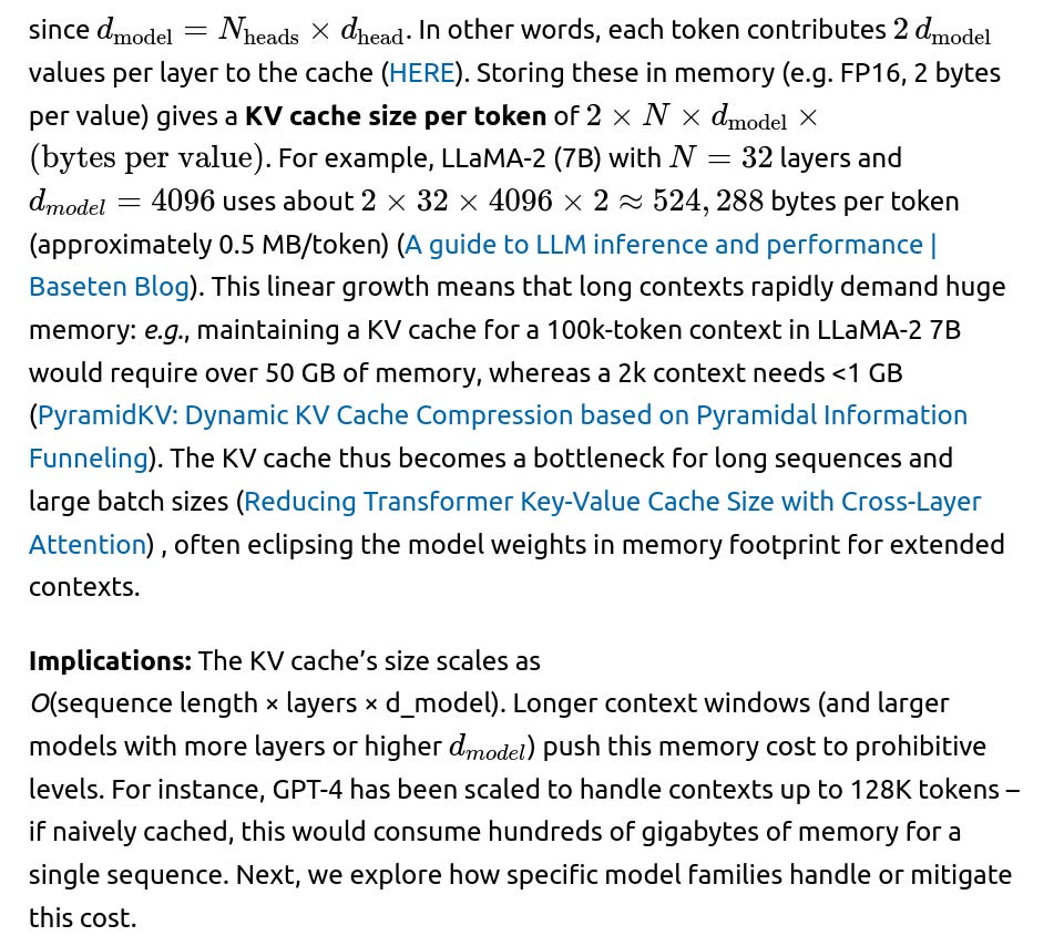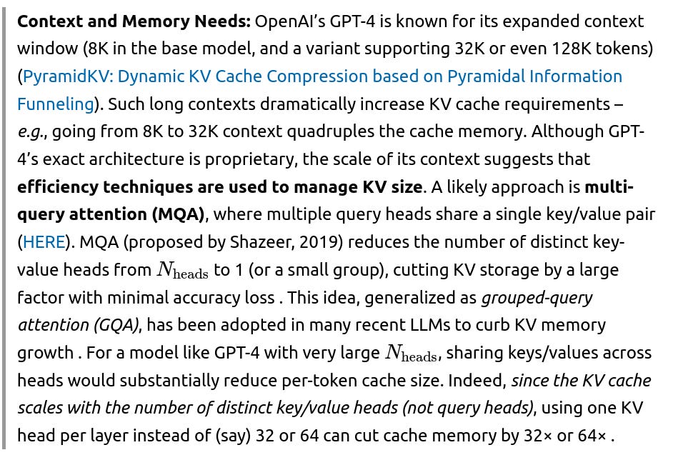 Memory Offloading: Another consideration for GPT-4’s 128K context is leveraging external memory. Research from 2024 shows that offloading KV tensors to CPU (host) memory can alleviate GPU memory pressure, at some cost to latency ([2502.08910v1.pdf](file://file-PFghuvAEVtWpQpXoLVPTFQ#:~:text=methods%20according%20to%20the%20internal,for%20a%201%20million%20to)). This is a strategy to enable extreme context lengths: for example, the InfiniteHiP system prunes irrelevant tokens and offloads KV to host memory, managing up to 3 million tokens on a single 48 GB GPU . While GPT-4’s implementation isn’t public, it likely uses a combination of these strategies – reducing the KV stored (via architectural choices like MQA/GQA) and possibly intelligent cache management – to handle its long context. The importance of such methods is underscored by recent work: even with weight compression, at 32K–128K sequences the KV cache becomes the main memory bottleneck for LLM inference (KVQuant: Towards 10 Million Context Length LLM Inference with KV Cache Quantization). In summary, GPT-4’s extended context demanded innovations to keep KV cache size feasible, including sharing keys/values across heads and advanced caching policies, allowing it to process up to 128K tokens of history without running out of memory.