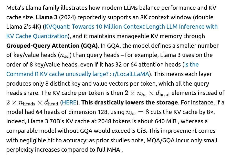 Multi-Query and Grouped-Query Attention: As noted, MQA/GQA are now widely adopted in LLMs (PaLM, Llama 2/3, etc.) to reduce KV heads (HERE) . This method strikes a balance between expressiveness and memory use, and is largely considered a solved practice for big models. For instance, Llama 2 70B used 8 KV heads (GQA) (Is the Command R KV cache unusually large? : r/LocalLLaMA), and many new models follow suit.