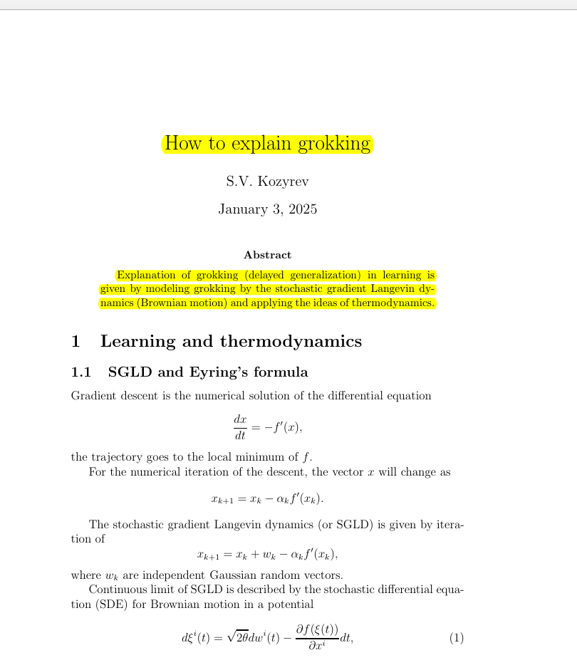 This paper proposes to explain grokking using concepts from thermodynamics and stochastic gradient Langevin dynamics. It suggests that grokking is a process of transitioning from sharp minima (memorization) to flat minima (generalization) in the loss landscape, driven by entropy maximization.